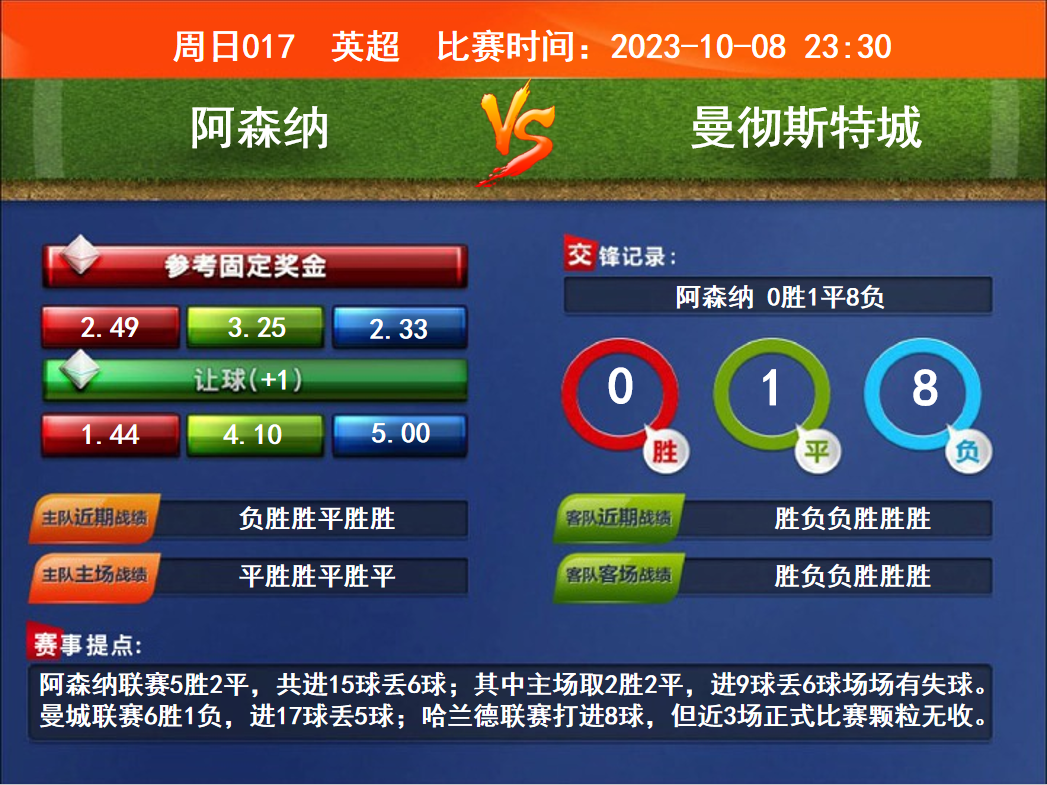比賽時(shí)間:2023-10-08 23:30賽事提點(diǎn):阿森納聯(lián)賽5勝2平,共進(jìn)15球丟6球;其中主場取2勝2平,進(jìn)9球丟6球場場有失球。曼城聯(lián)賽6勝1負(fù),進(jìn)17球丟5球;哈蘭德聯(lián)賽打進(jìn)8球,但近3場正式比賽顆粒無收。